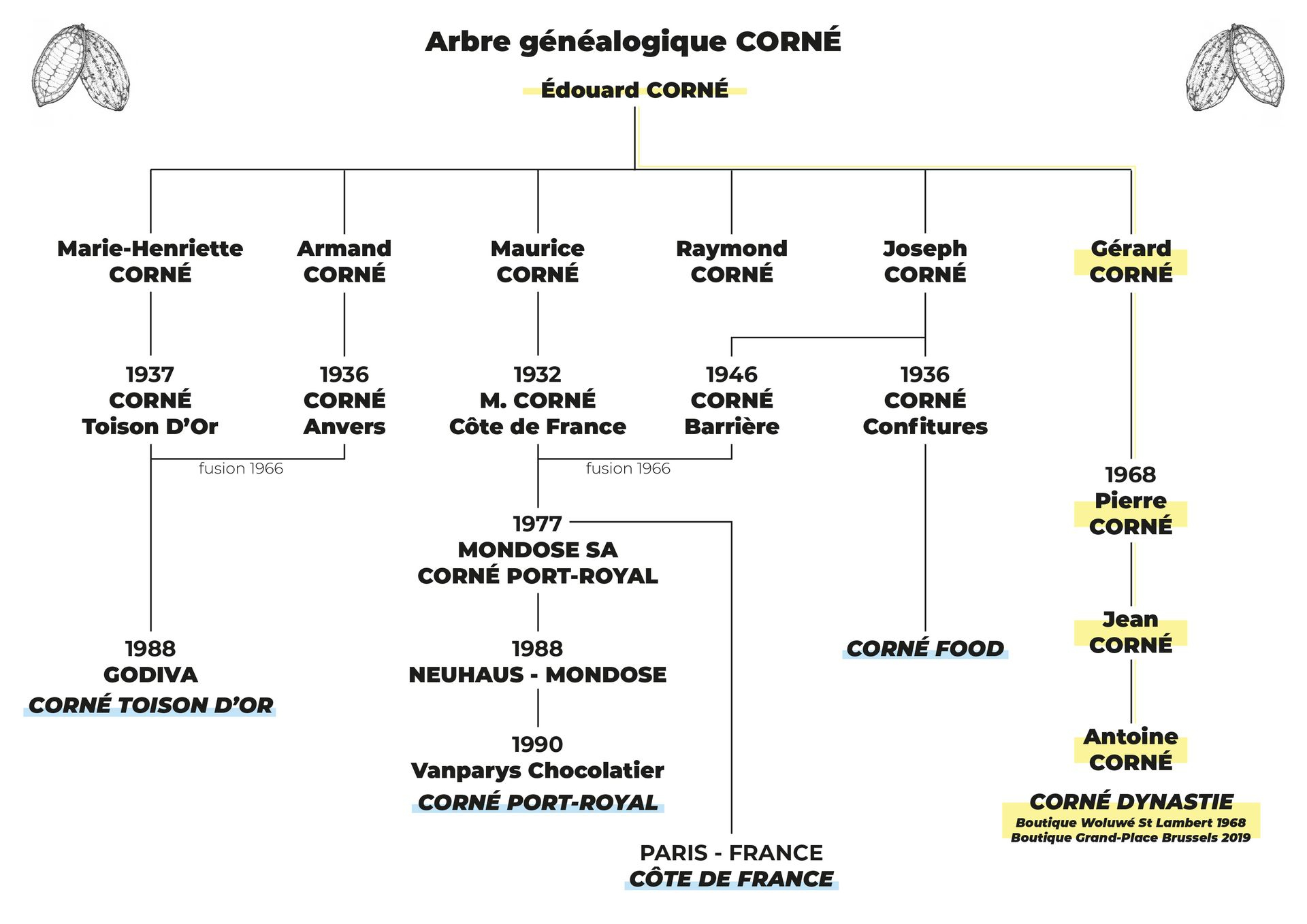 Dans la famille Corné le chocolat est réellement une affaire de tradition ! Jean Corné, représentant de la quatrième génération de chocolatier Corné, a appris le métier de son père. Depuis 2010, la 5ème génération est en marche avec Antoine Corné, le fils de Jean, qui travaille également au sein de l’entreprise familiale.